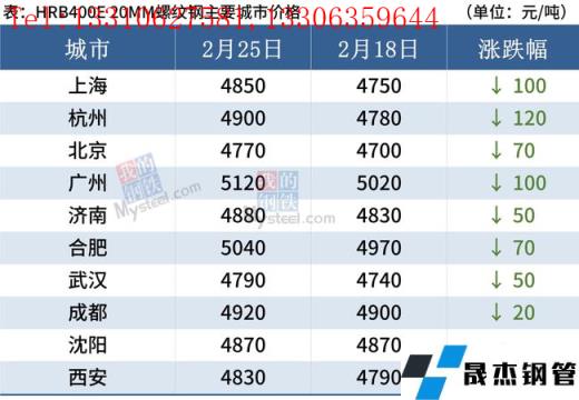截至2月25日,全國主要城市20mm三級(jí)抗震螺紋鋼均價(jià)4869元/噸,周環(huán)比下跌53元/噸;8.0mmHPB300高線均價(jià)5067元/噸,周環(huán)比下跌58元/噸。